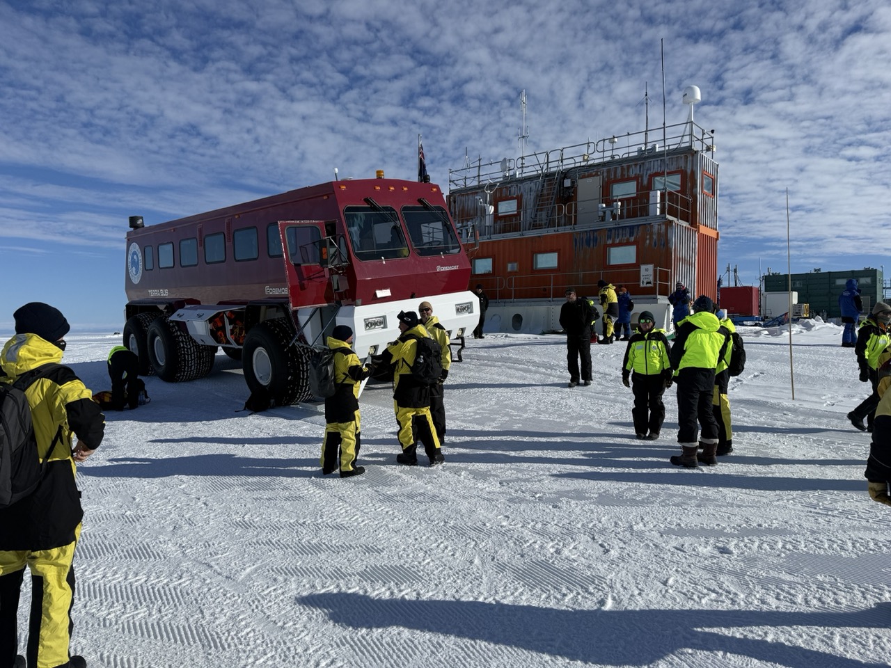 We walked out the door and down the cold metal stairs, and were ushered across the groomed apron to the Terrabus. Similar to Ivan the Terrabus from the USAP this is a giant with HUGE wheels that are almost as tall as I am and alot of ground clearance.